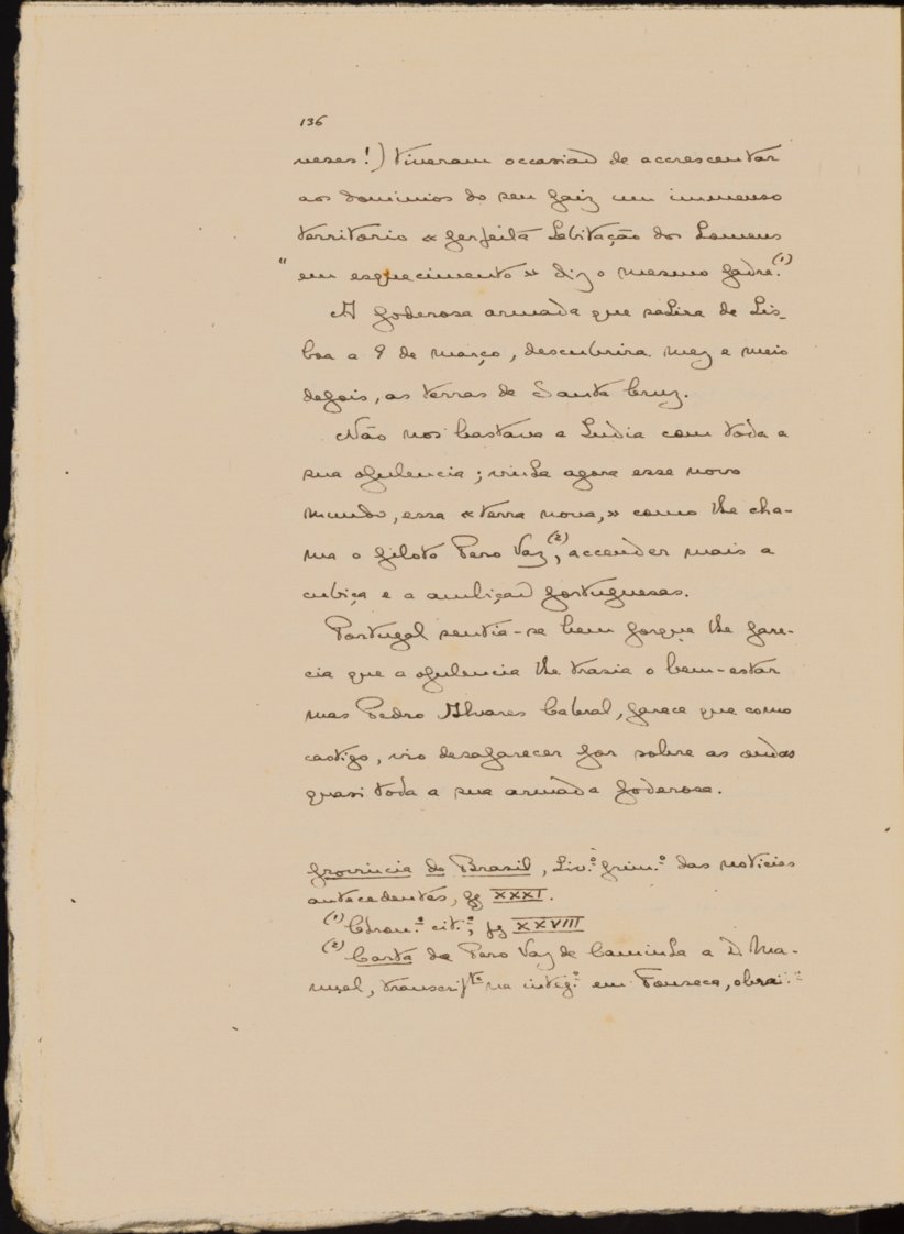 Obra Novo anno historico, ou Novo diario portuguez [manuscrito] : noticia abreviada de pessoas grandes e cousas notaveis de Portugal / Belizário Pimenta. Cópia em JPEG Encadernação DigitalI - 1 de Dezembro de 1640 - A Restauração II - 8 de Dezembro de 1720 - A Academia real d[e] historia Portuguesa III - 25 de Novembro de 1510 - Tomada de Goa por Affonso de Albuquerque IV - 11 de Agosto de 1829 - Victoria da Villa da Praia, nos Açores V - 26 de Janeiro de 1831 - Gil Vicente e a Inquisição VI - 4 de Dezembro de 1822 - O desterro do Ramalhão VII - 11 de Dezembro de 1795 - A divisão auxiliar portuguesa, nas campanhas de Roussillou e da Catalunha VIII - 18 de Julho de 1546 - O segundo cerco de Diu - O primeiro assalto IX - 27 de Novembro de 1807 - Embarque de D.João VI para o Brasil X - 14 de Fevereiro de 1387 - Casamento de D.João I e Filipa de Lencastre XI - 2 de Fevereiro de 1531 - A Ilha dos mortos XII - 5 de Fevereiro de 1525 - D. João III e o casamento XIII - 12 de Fevereiro de 1345 - Affonso IV e as ilhas canarias XIV - A viagem do monte sinai XV - 23 de Fevereiro de 1823 - O conde de Amarante e o absolutismo XVI - 5 de Março de 1823 - O conde de Amarante e as cortes de vinte XVII - 9 de Março de 1500 - A partida de Pedro Alvares Cabral XVIII - 15 de Março de 1147 - A tomada de Santarém XIX - 30 de Março de 1818 - D.João VI e a pedreirada XX - 6 de Abril de 1384 - A batalha dos Atoleiros XXI - 13 de Abril de 1821 - AO brigadeiro João Carlos de Saldanha no governo do Rio Grande do Sul XXII - 12 de Março de 1811 - A acção da Redinha XXIII - 30 de Abril de 1824 - A abrilada XXIV - 5 de Agosto de 1709 - A primeira ascensão do (padre voador) XXV - 16 de Abril de 1347 - As barbas de Viso-Rey | Encadernação Digital > XVII - 9 de Março de 1500 - A partida de Pedro Alvares Cabral > 136 Tipo:image/jpeg Tamanho:88 KB Cor:24 bpp