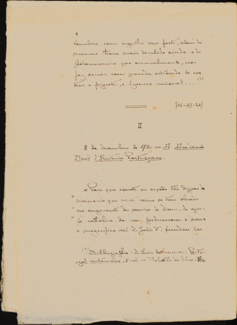 Obra Novo anno historico, ou Novo diario portuguez [manuscrito] : noticia abreviada de pessoas grandes e cousas notaveis de Portugal / Belizário Pimenta. Cópia em JPEG Encadernação DigitalI - 1 de Dezembro de 1640 - A Restauração II - 8 de Dezembro de 1720 - A Academia real d[e] historia Portuguesa III - 25 de Novembro de 1510 - Tomada de Goa por Affonso de Albuquerque IV - 11 de Agosto de 1829 - Victoria da Villa da Praia, nos Açores V - 26 de Janeiro de 1831 - Gil Vicente e a Inquisição VI - 4 de Dezembro de 1822 - O desterro do Ramalhão VII - 11 de Dezembro de 1795 - A divisão auxiliar portuguesa, nas campanhas de Roussillou e da Catalunha VIII - 18 de Julho de 1546 - O segundo cerco de Diu - O primeiro assalto IX - 27 de Novembro de 1807 - Embarque de D.João VI para o Brasil X - 14 de Fevereiro de 1387 - Casamento de D.João I e Filipa de Lencastre XI - 2 de Fevereiro de 1531 - A Ilha dos mortos XII - 5 de Fevereiro de 1525 - D. João III e o casamento XIII - 12 de Fevereiro de 1345 - Affonso IV e as ilhas canarias XIV - A viagem do monte sinai XV - 23 de Fevereiro de 1823 - O conde de Amarante e o absolutismo XVI - 5 de Março de 1823 - O conde de Amarante e as cortes de vinte XVII - 9 de Março de 1500 - A partida de Pedro Alvares Cabral XVIII - 15 de Março de 1147 - A tomada de Santarém XIX - 30 de Março de 1818 - D.João VI e a pedreirada XX - 6 de Abril de 1384 - A batalha dos Atoleiros XXI - 13 de Abril de 1821 - AO brigadeiro João Carlos de Saldanha no governo do Rio Grande do Sul XXII - 12 de Março de 1811 - A acção da Redinha XXIII - 30 de Abril de 1824 - A abrilada XXIV - 5 de Agosto de 1709 - A primeira ascensão do (padre voador) XXV - 16 de Abril de 1347 - As barbas de Viso-Rey | Encadernação Digital > II - 8 de Dezembro de 1720 - A Academia real d[e] historia Portuguesa > 8 Tipo:image/jpeg Tamanho:75 KB Cor:24 bpp