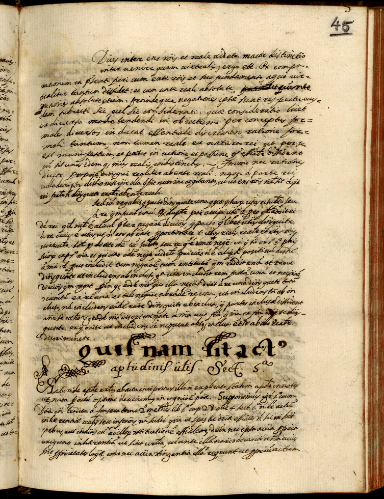 Obra LOPES, Domingos, 1588-1653 - Disputationes in Log[ic]a[m] Conimbr[icensis] [manuscrito], 1626. Cópia em JPEG Índice [Página de título] [Proaemium] [Disputatio prima] Disputationis in logicam conimb[ricensis] Disputatio [prim]a. De sp[ec]i illigi[bi]li Disputatio [secund]a. De vnitate et ap[ti]tudin[is] v[nive]r[sa]lis De p[rin]cipuis alijs defficultatibus ad u[nita]te spectantib[us] Disputatio [tertia]a De ente r[ati]o[n]is. Disputatio [quart]a De signis. Disputatio [quint]a De operatione i[nte]ll[ect]us. Disputatio [septim]a De ap[re]hentio[n]e, et iuditis. Disp[utatio] [non]a | Índice > Disputationis in logicam conimb[ricensis] > Disputatio [secund]a. De vnitate et ap[ti]tudin[is] v[nive]r[sa]lis > Sect[io] [quint]a > 45 |