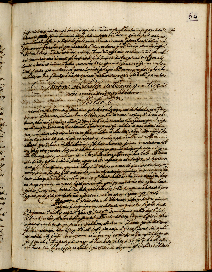 Obra LOPES, Domingos, 1588-1653 - Disputationes in Log[ic]a[m] Conimbr[icensis] [manuscrito], 1626. Cópia em JPEG Índice [Página de título] [Proaemium] [Disputatio prima] Disputationis in logicam conimb[ricensis] Disputatio [prim]a. De sp[ec]i illigi[bi]li Disputatio [secund]a. De vnitate et ap[ti]tudin[is] v[nive]r[sa]lis De p[rin]cipuis alijs defficultatibus ad u[nita]te spectantib[us] Disputatio [tertia]a De ente r[ati]o[n]is. Disputatio [quart]a De signis. Disputatio [quint]a De operatione i[nte]ll[ect]us. Disputatio [septim]a De ap[re]hentio[n]e, et iuditis. Disp[utatio] [non]a | Índice > Disputationis in logicam conimb[ricensis] > De p[rin]cipuis alijs defficultatibus ad u[nita]te spectantib[us] Disputatio [tertia]a > Sectio [sext]a > 64 |