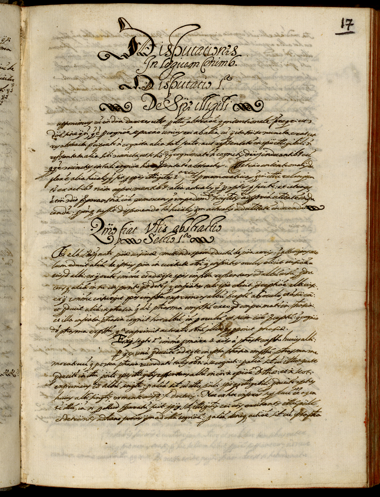 Obra LOPES, Domingos, 1588-1653 - Disputationes in Log[ic]a[m] Conimbr[icensis] [manuscrito], 1626. Cópia em JPEG Índice [Página de título] [Proaemium] [Disputatio prima] Disputationis in logicam conimb[ricensis] Disputatio [prim]a. De sp[ec]i illigi[bi]li Disputatio [secund]a. De vnitate et ap[ti]tudin[is] v[nive]r[sa]lis De p[rin]cipuis alijs defficultatibus ad u[nita]te spectantib[us] Disputatio [tertia]a De ente r[ati]o[n]is. Disputatio [quart]a De signis. Disputatio [quint]a De operatione i[nte]ll[ect]us. Disputatio [septim]a De ap[re]hentio[n]e, et iuditis. Disp[utatio] [non]a | Índice > Disputationis in logicam conimb[ricensis] > Disputatio [prim]a. De sp[ec]i illigi[bi]li > 17 |