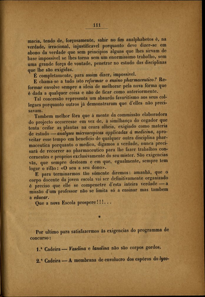 Obra Algumas considerações sobre a pharmacia portugueza Cópia em JPEG Encadernação DigitalHISTORIA DA PHARMACIA EM PORTUGAL - LEGISLAÇÃO PHARMACEUTICAXIV b 1 FUNDAÇÃO DO ESTUDO GERAL EM LISBOA ORGANIZAÇÃO DO ENSINO PHARMACEUTICO9 Creação do curso de lª classe na Universidade DA PHARMACOPÉA33 I - Da necessidade de fórmulas para casos omissos de algumas preparações pharmaceuticas II - Do lycopodio como intermedio da massa pilular III - Da limonada de citrato de magnesia com força dupla IV - Da pomada mercurial da Pharmacopêa | Encadernação Digital > CONCLUSÃO > 111 Tipo:image/jpeg Tamanho:161 KB Cor:24 bpp