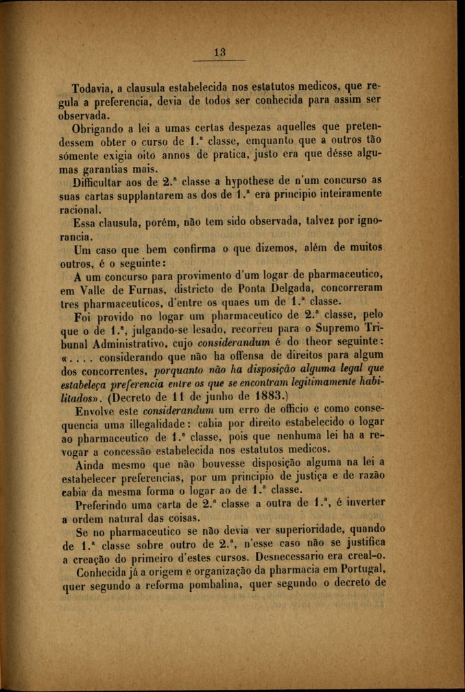Obra Algumas considerações sobre a pharmacia portugueza Cópia em JPEG | Encadernação Digital > HISTORIA DA PHARMACIA EM PORTUGAL - LEGISLAÇÃO PHARMACEUTICA > ORGANIZAÇÃO DO ENSINO PHARMACEUTICO > Creação do curso de lª classe na Universidade > 13 |