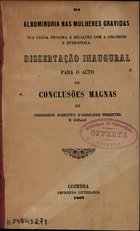 Da albuminuria nas mulheres gravidas : sua causa proxima e relações com a chlorose e hydropesia / De Fernando Augusto d'Andrade Pimentel e Mello. - Coimbra : Imprensa Litteraria, 1862. - 62, [1, 1 br.