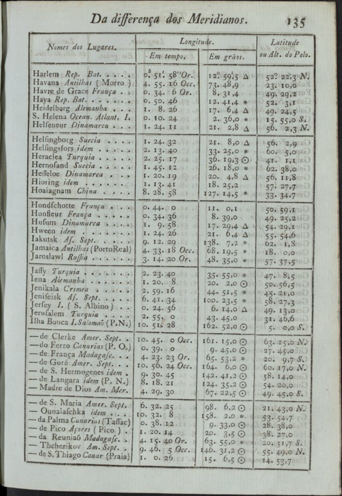 Obra Ephemerides astronómicas : calculadas para o meridiano do Observatorio da Universidade de Coimbra. Cópia em JPEG Encadernação Digital TABOA Da diferença dos Meridianos dos Lugares principais da Terra, relativamente ao Observatorio da Univerfdade de Coimbra com as suas Latitudes, ou Alturas do Polo TABOA - Cosmographica dos Portos , Cabos , Ilhas e Lugares das Costas Maritimas do Orbe Terráqueo, pela ordem das mesmas Costas com as suas Latitudes, e Longitudes contadas do Meridiano do Observatorio da da Universidade de Coimbra EXPLICAÇÃO DAS EPHEMERIDES OBSERVAÇÕES ASTRONOMICAS FEITAS EM COIMBRA NO OBSERVATORIO REAL DA UNIVERSIDADE OBSERVAÇÕES ASTRONOMICAS FEITAS EM LISBOA NO OBSERVATORIO REAL DA MARINHA | Encadernação Digital > TABOA Da diferença dos Meridianos dos Lugares principais da Terra, relativamente ao Observatorio da Univerfdade de Coimbra com as suas Latitudes, ou Alturas do Polo > 135 |