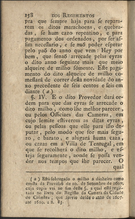 Obra PEREIRA, Joaquim da Silva - Resumo, ou index dos alvarás, cartas, decretos, foraes, leys, privilegios, provisoens, e regimentos, que alguns monarcas deste reino de Portugal passáram..., 1786. Cópia em JPEG Índice Capitulo I. Em que se expendem os Alvarás dos Reys D. Affonso VI., D. Filippe II., D. Filippe III., D. Filippe IV., do Cardeal D. Henrique, D. Joaõ III., D. Joaõ IV., do Principe D. Pedro, delRey D. Pedro, e de D. Sebastiaõ Capitulo II. Em que se relataõ as Cartas, de Filippe III. Filippe IV. D. Joaõ IV. e de ElRey D. Manoel Capitulo III. Em que se referem os Decretos de ElRey D. Affonso VI. e do Principe D. Pedro e depois Rey Capitulo IV. Em que se expoem as Leys de D. Affonso VI. D. Filippe II. e de D. Filippe III. de D. Joaõ IV. de D. Manoel, de D. Pedro naõ so como Principe, e Regente do Reyno, senaõ como Rey Capitulo V. No qual se mostraõ os privilegios de ElRey D. Affonso Henriques, de ElRey D. Diniz, e de ElRey D. Joaõ I. e de ElRey D. Manoel Capitulo VI. Em que se declaraõ as Provisoens dos Reys D. Filippe II. D. Filippe III. do Cardeal Rey D. Henrique, de D. Joaõ IV. de D. Pedro, e de D. Sebastiaõ Capitulo VII. Em que se declaraõ os Regimentos de ElRey D. Filippe III. de Castella e II. de Portugal, e de ElRey D. Sebastiaõ, e do Principe D. Pedro [Protesto do autor] Erratas | Índice > Capitulo VII. Em que se declaraõ os Regimentos de ElRey D. Filippe III. de Castella e II. de Portugal, e de ElRey D. Sebastiaõ, e do Principe D. Pedro > 158 |