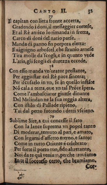Obra CAMÕES, Luís de - Lusiada italiana di Carlo Antonio Paggi..., 1659. Cópia em JPEG Índice [Portada] [Carta a Gio Georgio Giustiniano sobre Os Lusíadas, suas traduções e vida de Camões] [Poemas: homenagens a D. Luís Vasco da Gama, Marquês de Nisa, a D. Jerónimo de Ataíde, conde de Atouguia, a D. António de Meneses, conde de Cantanhede, e aos Académicos Insensatos de Perugia] Canto primo Canto secondo Canto terzo Canto qvarto Canto qvinto Canto sesto Canto settimo Canto ottavo Canto nono Canto decimo | Índice > Canto secondo > 32 |