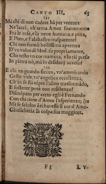 Obra CAMÕES, Luís de - Lusiada italiana di Carlo Antonio Paggi..., 1659. Cópia em JPEG Índice [Portada] [Carta a Gio Georgio Giustiniano sobre Os Lusíadas, suas traduções e vida de Camões] [Poemas: homenagens a D. Luís Vasco da Gama, Marquês de Nisa, a D. Jerónimo de Ataíde, conde de Atouguia, a D. António de Meneses, conde de Cantanhede, e aos Académicos Insensatos de Perugia] Canto primo Canto secondo Canto terzo Canto qvarto Canto qvinto Canto sesto Canto settimo Canto ottavo Canto nono Canto decimo | Índice > Canto terzo > 63 |