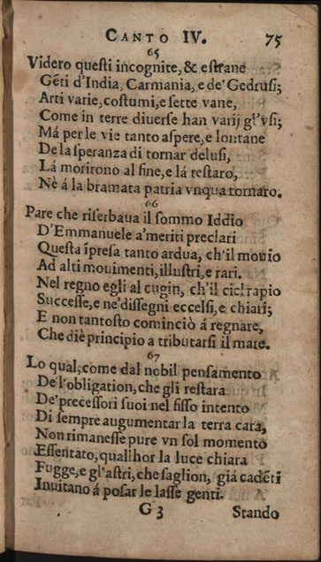 Obra CAMÕES, Luís de - Lusiada italiana di Carlo Antonio Paggi..., 1659. Cópia em JPEG Índice [Portada] [Carta a Gio Georgio Giustiniano sobre Os Lusíadas, suas traduções e vida de Camões] [Poemas: homenagens a D. Luís Vasco da Gama, Marquês de Nisa, a D. Jerónimo de Ataíde, conde de Atouguia, a D. António de Meneses, conde de Cantanhede, e aos Académicos Insensatos de Perugia] Canto primo Canto secondo Canto terzo Canto qvarto Canto qvinto Canto sesto Canto settimo Canto ottavo Canto nono Canto decimo | Índice > Canto qvarto > 75 |