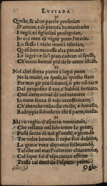 Obra CAMÕES, Luís de - Lusiada italiana di Carlo Antonio Paggi..., 1659. Cópia em JPEG Índice [Portada] [Carta a Gio Georgio Giustiniano sobre Os Lusíadas, suas traduções e vida de Camões] [Poemas: homenagens a D. Luís Vasco da Gama, Marquês de Nisa, a D. Jerónimo de Ataíde, conde de Atouguia, a D. António de Meneses, conde de Cantanhede, e aos Académicos Insensatos de Perugia] Canto primo Canto secondo Canto terzo Canto qvarto Canto qvinto Canto sesto Canto settimo Canto ottavo Canto nono Canto decimo | Índice > Canto qvarto > 79v |