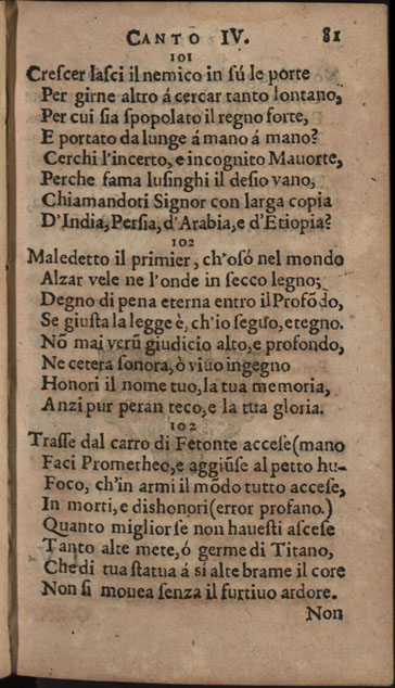 Obra CAMÕES, Luís de - Lusiada italiana di Carlo Antonio Paggi..., 1659. Cópia em JPEG Índice [Portada] [Carta a Gio Georgio Giustiniano sobre Os Lusíadas, suas traduções e vida de Camões] [Poemas: homenagens a D. Luís Vasco da Gama, Marquês de Nisa, a D. Jerónimo de Ataíde, conde de Atouguia, a D. António de Meneses, conde de Cantanhede, e aos Académicos Insensatos de Perugia] Canto primo Canto secondo Canto terzo Canto qvarto Canto qvinto Canto sesto Canto settimo Canto ottavo Canto nono Canto decimo | Índice > Canto qvarto > 81 |