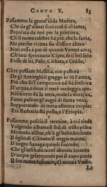 Obra CAMÕES, Luís de - Lusiada italiana di Carlo Antonio Paggi..., 1659. Cópia em JPEG Índice [Portada] [Carta a Gio Georgio Giustiniano sobre Os Lusíadas, suas traduções e vida de Camões] [Poemas: homenagens a D. Luís Vasco da Gama, Marquês de Nisa, a D. Jerónimo de Ataíde, conde de Atouguia, a D. António de Meneses, conde de Cantanhede, e aos Académicos Insensatos de Perugia] Canto primo Canto secondo Canto terzo Canto qvarto Canto qvinto Canto sesto Canto settimo Canto ottavo Canto nono Canto decimo | Índice > Canto qvinto > 83 |