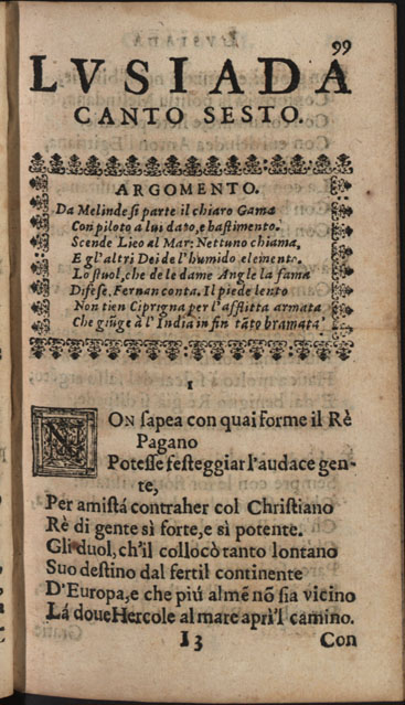 Obra CAMÕES, Luís de - Lusiada italiana di Carlo Antonio Paggi..., 1659. Cópia em JPEG Índice [Portada] [Carta a Gio Georgio Giustiniano sobre Os Lusíadas, suas traduções e vida de Camões] [Poemas: homenagens a D. Luís Vasco da Gama, Marquês de Nisa, a D. Jerónimo de Ataíde, conde de Atouguia, a D. António de Meneses, conde de Cantanhede, e aos Académicos Insensatos de Perugia] Canto primo Canto secondo Canto terzo Canto qvarto Canto qvinto Canto sesto Canto settimo Canto ottavo Canto nono Canto decimo | Índice > Canto sesto > 99 |