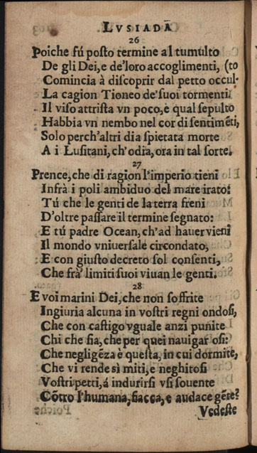 Obra CAMÕES, Luís de - Lusiada italiana di Carlo Antonio Paggi..., 1659. Cópia em JPEG Índice [Portada] [Carta a Gio Georgio Giustiniano sobre Os Lusíadas, suas traduções e vida de Camões] [Poemas: homenagens a D. Luís Vasco da Gama, Marquês de Nisa, a D. Jerónimo de Ataíde, conde de Atouguia, a D. António de Meneses, conde de Cantanhede, e aos Académicos Insensatos de Perugia] Canto primo Canto secondo Canto terzo Canto qvarto Canto qvinto Canto sesto Canto settimo Canto ottavo Canto nono Canto decimo | Índice > Canto sesto > 103v |
