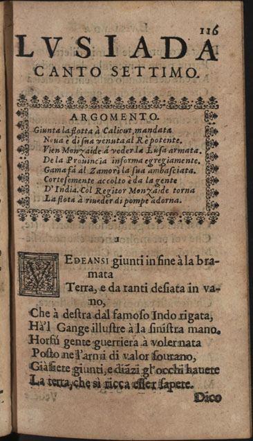Obra CAMÕES, Luís de - Lusiada italiana di Carlo Antonio Paggi..., 1659. Cópia em JPEG Índice [Portada] [Carta a Gio Georgio Giustiniano sobre Os Lusíadas, suas traduções e vida de Camões] [Poemas: homenagens a D. Luís Vasco da Gama, Marquês de Nisa, a D. Jerónimo de Ataíde, conde de Atouguia, a D. António de Meneses, conde de Cantanhede, e aos Académicos Insensatos de Perugia] Canto primo Canto secondo Canto terzo Canto qvarto Canto qvinto Canto sesto Canto settimo Canto ottavo Canto nono Canto decimo | Índice > Canto settimo > 116 |