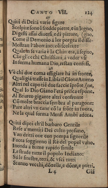 Obra CAMÕES, Luís de - Lusiada italiana di Carlo Antonio Paggi..., 1659. Cópia em JPEG Índice [Portada] [Carta a Gio Georgio Giustiniano sobre Os Lusíadas, suas traduções e vida de Camões] [Poemas: homenagens a D. Luís Vasco da Gama, Marquês de Nisa, a D. Jerónimo de Ataíde, conde de Atouguia, a D. António de Meneses, conde de Cantanhede, e aos Académicos Insensatos de Perugia] Canto primo Canto secondo Canto terzo Canto qvarto Canto qvinto Canto sesto Canto settimo Canto ottavo Canto nono Canto decimo | Índice > Canto settimo > 124 |