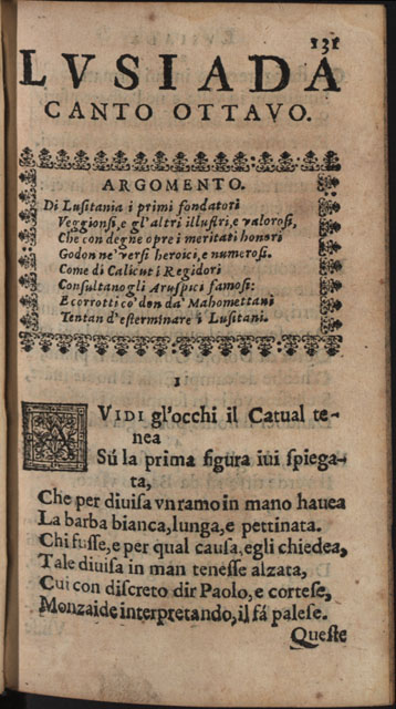Obra CAMÕES, Luís de - Lusiada italiana di Carlo Antonio Paggi..., 1659. Cópia em JPEG Índice [Portada] [Carta a Gio Georgio Giustiniano sobre Os Lusíadas, suas traduções e vida de Camões] [Poemas: homenagens a D. Luís Vasco da Gama, Marquês de Nisa, a D. Jerónimo de Ataíde, conde de Atouguia, a D. António de Meneses, conde de Cantanhede, e aos Académicos Insensatos de Perugia] Canto primo Canto secondo Canto terzo Canto qvarto Canto qvinto Canto sesto Canto settimo Canto ottavo Canto nono Canto decimo | Índice > Canto ottavo > 131 |