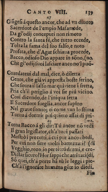 Obra CAMÕES, Luís de - Lusiada italiana di Carlo Antonio Paggi..., 1659. Cópia em JPEG Índice [Portada] [Carta a Gio Georgio Giustiniano sobre Os Lusíadas, suas traduções e vida de Camões] [Poemas: homenagens a D. Luís Vasco da Gama, Marquês de Nisa, a D. Jerónimo de Ataíde, conde de Atouguia, a D. António de Meneses, conde de Cantanhede, e aos Académicos Insensatos de Perugia] Canto primo Canto secondo Canto terzo Canto qvarto Canto qvinto Canto sesto Canto settimo Canto ottavo Canto nono Canto decimo | Índice > Canto ottavo > 139 |