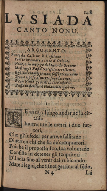 Obra CAMÕES, Luís de - Lusiada italiana di Carlo Antonio Paggi..., 1659. Cópia em JPEG Índice [Portada] [Carta a Gio Georgio Giustiniano sobre Os Lusíadas, suas traduções e vida de Camões] [Poemas: homenagens a D. Luís Vasco da Gama, Marquês de Nisa, a D. Jerónimo de Ataíde, conde de Atouguia, a D. António de Meneses, conde de Cantanhede, e aos Académicos Insensatos de Perugia] Canto primo Canto secondo Canto terzo Canto qvarto Canto qvinto Canto sesto Canto settimo Canto ottavo Canto nono Canto decimo | Índice > Canto nono > 148 |
