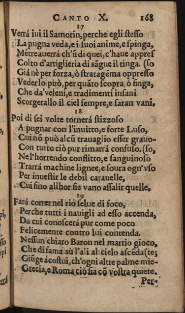 Obra CAMÕES, Luís de - Lusiada italiana di Carlo Antonio Paggi..., 1659. Cópia em JPEG Índice [Portada] [Carta a Gio Georgio Giustiniano sobre Os Lusíadas, suas traduções e vida de Camões] [Poemas: homenagens a D. Luís Vasco da Gama, Marquês de Nisa, a D. Jerónimo de Ataíde, conde de Atouguia, a D. António de Meneses, conde de Cantanhede, e aos Académicos Insensatos de Perugia] Canto primo Canto secondo Canto terzo Canto qvarto Canto qvinto Canto sesto Canto settimo Canto ottavo Canto nono Canto decimo | Índice > Canto decimo > 168 |