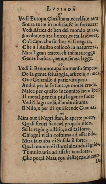Obra CAMÕES, Luís de - Lusiada italiana di Carlo Antonio Paggi..., 1659. Cópia em JPEG Índice [Portada] [Carta a Gio Georgio Giustiniano sobre Os Lusíadas, suas traduções e vida de Camões] [Poemas: homenagens a D. Luís Vasco da Gama, Marquês de Nisa, a D. Jerónimo de Ataíde, conde de Atouguia, a D. António de Meneses, conde de Cantanhede, e aos Académicos Insensatos de Perugia] Canto primo Canto secondo Canto terzo Canto qvarto Canto qvinto Canto sesto Canto settimo Canto ottavo Canto nono Canto decimo | Índice > Canto decimo > 180v |