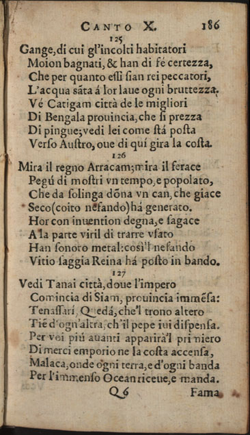 Obra CAMÕES, Luís de - Lusiada italiana di Carlo Antonio Paggi..., 1659. Cópia em JPEG Índice [Portada] [Carta a Gio Georgio Giustiniano sobre Os Lusíadas, suas traduções e vida de Camões] [Poemas: homenagens a D. Luís Vasco da Gama, Marquês de Nisa, a D. Jerónimo de Ataíde, conde de Atouguia, a D. António de Meneses, conde de Cantanhede, e aos Académicos Insensatos de Perugia] Canto primo Canto secondo Canto terzo Canto qvarto Canto qvinto Canto sesto Canto settimo Canto ottavo Canto nono Canto decimo | Índice > Canto decimo > 186 |