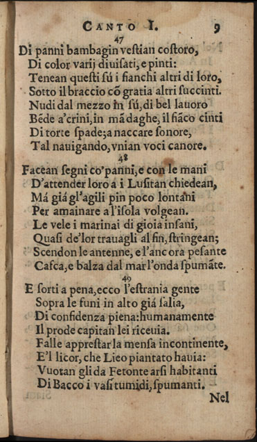 Obra CAMÕES, Luís de - Lusiada italiana di Carlo Antonio Paggi..., 1659. Cópia em JPEG Índice [Portada] [Carta a Gio Georgio Giustiniano sobre Os Lusíadas, suas traduções e vida de Camões] [Poemas: homenagens a D. Luís Vasco da Gama, Marquês de Nisa, a D. Jerónimo de Ataíde, conde de Atouguia, a D. António de Meneses, conde de Cantanhede, e aos Académicos Insensatos de Perugia] Canto primo Canto secondo Canto terzo Canto qvarto Canto qvinto Canto sesto Canto settimo Canto ottavo Canto nono Canto decimo | Índice > Canto primo > 9 |