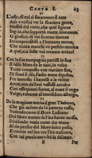Obra CAMÕES, Luís de - Lusiada italiana di Carlo Antonio Paggi..., 1659. Cópia em JPEG Índice [Portada] [Carta a Gio Georgio Giustiniano sobre Os Lusíadas, suas traduções e vida de Camões] [Poemas: homenagens a D. Luís Vasco da Gama, Marquês de Nisa, a D. Jerónimo de Ataíde, conde de Atouguia, a D. António de Meneses, conde de Cantanhede, e aos Académicos Insensatos de Perugia] Canto primo Canto secondo Canto terzo Canto qvarto Canto qvinto Canto sesto Canto settimo Canto ottavo Canto nono Canto decimo | Índice > Canto primo > 13 |