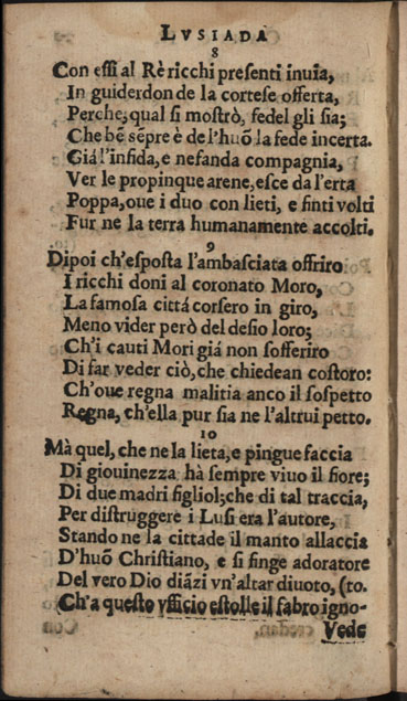 Obra CAMÕES, Luís de - Lusiada italiana di Carlo Antonio Paggi..., 1659. Cópia em JPEG Índice [Portada] [Carta a Gio Georgio Giustiniano sobre Os Lusíadas, suas traduções e vida de Camões] [Poemas: homenagens a D. Luís Vasco da Gama, Marquês de Nisa, a D. Jerónimo de Ataíde, conde de Atouguia, a D. António de Meneses, conde de Cantanhede, e aos Académicos Insensatos de Perugia] Canto primo Canto secondo Canto terzo Canto qvarto Canto qvinto Canto sesto Canto settimo Canto ottavo Canto nono Canto decimo | Índice > Canto secondo > 20v |