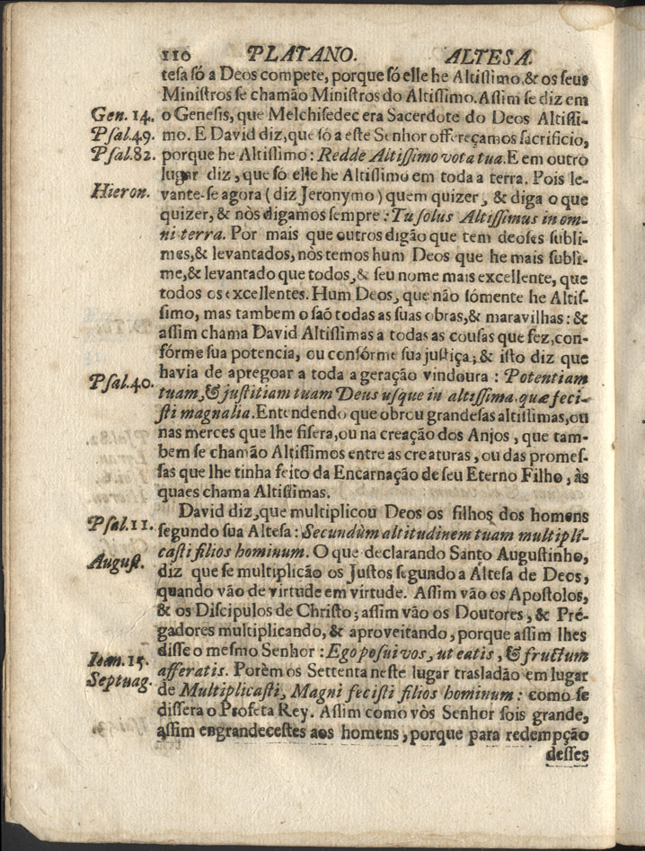 Obra BARREIRA, Isidoro de, O.M.C. - Tratado das significaçoens das plantas, flores, e fruttos, que se referem na Sagrada Escrittura, 1698. Cópia em JPEG Índice[Encadernação com marca de posse] [Rosto com marca de posse] Taboada das plantas, flores, e fruttos […] Primeira parteFrutto da Palma. Doutrina Calamo aromatico. Confissaõ Casca de Romã. Modestia, Pejo Flor da vinha. Bons intentos Folhas de vinha. Esperanças perdidas Amendoeira. Esperanças seguras Flor de Amendoeira. Velhice do homem Figos lampos. Bens anticipados Figos verdes. Fruttos sem proveito Folhas de figueira. Penitencia Figueira brava. Temperança Junco do Egypto. Abstinencia Segunda parte das plantas e flores, referidas na Sagrada Escrittura, com seus significadosRosa com espinhos. Gostos da vida Lirio de cor do Ceo. Eloquencia Flores Jacinthas. Sabedoria Flores Nacisas. Gentilesa Aboboreira. Esperanças vãs Cominhos. Pragas, Maldições Junco. Fingimento, hypocrisia Losna. Remordimento da alma Linho. Santidade, Justificaçaõ Feto, e can[n]a. Odio capital Sacrae Scripturae loca […] | Índice > Primeira parte > Platano. Altesa > 110 Tipo:image/jpeg Tamanho:263 KB Cor:24 bpp