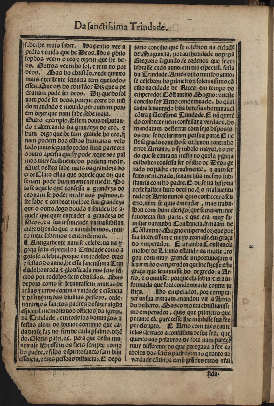 Obra ROSÁRIO, Diogo do, O.P. - Historia das vidas & feitos heroicos & obras insignes dos sanctos, que nesta seguda parte se contem, 1567. Cópia em JPEG Índice[Encadernação com marca de posse e nota manuscrita] Da festa da san[n]ctissima Trindade Do sacratissimo sacrame[n]to da eucharistia Sermão do sancto tempo da Coresma Do sacratisimo dis de quinta feira da Cea do Senhor Da sacratisima morte e paixam de nosso saluador Jesu Chr[ist]o Da gloriosa Ressurreiçã de nosso rede[m]ptor Da gloriosa Ascensam aos ceos do filho de Deos nosso redemptor e saluador Jesu Chr[ist]o Da sacratissima festa do spirito sancto | Índice > Da festa da san[n]ctissima Trindade > IIv Tipo:image/jpeg Tamanho:359 KB Cor:24 bpp