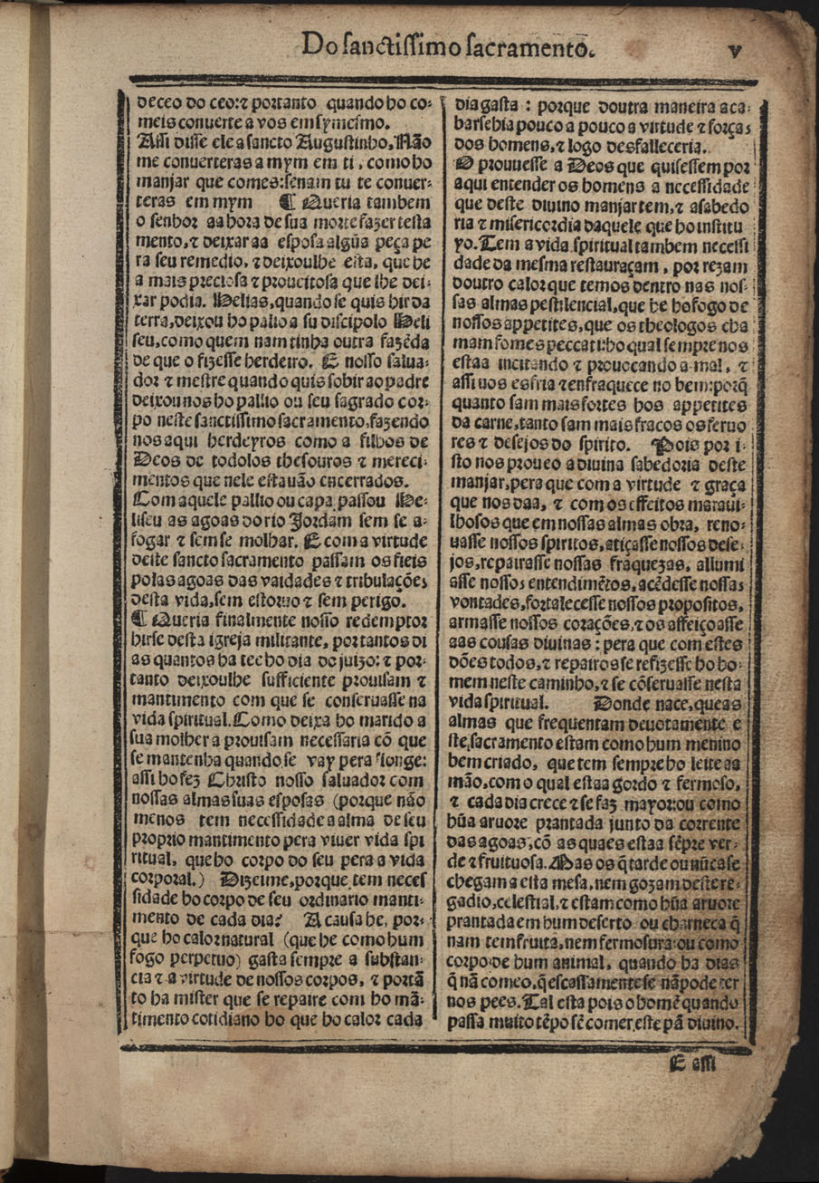 Obra ROSÁRIO, Diogo do, O.P. - Historia das vidas & feitos heroicos & obras insignes dos sanctos, que nesta seguda parte se contem, 1567. Cópia em JPEG Índice[Encadernação com marca de posse e nota manuscrita] Da festa da san[n]ctissima Trindade Do sacratissimo sacrame[n]to da eucharistia Sermão do sancto tempo da Coresma Do sacratisimo dis de quinta feira da Cea do Senhor Da sacratisima morte e paixam de nosso saluador Jesu Chr[ist]o Da gloriosa Ressurreiçã de nosso rede[m]ptor Da gloriosa Ascensam aos ceos do filho de Deos nosso redemptor e saluador Jesu Chr[ist]o Da sacratissima festa do spirito sancto | Índice > Do sacratissimo sacrame[n]to da eucharistia > V Tipo:image/jpeg Tamanho:368 KB Cor:24 bpp