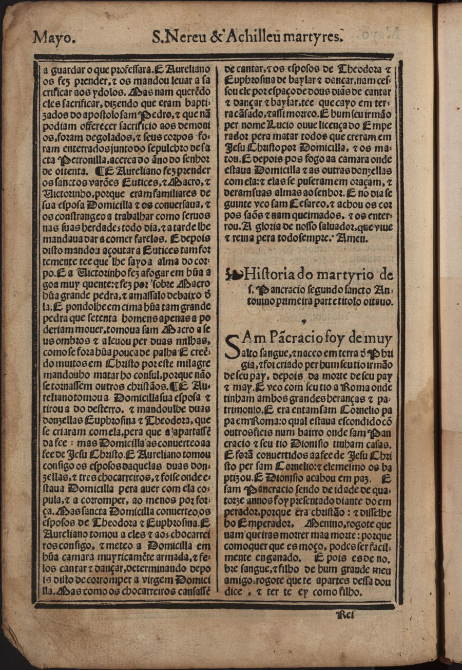 Obra ROSÁRIO, Diogo do, O.P. - Historia das vidas & feitos heroicos & obras insignes dos sanctos, que nesta seguda parte se contem, 1567. Cópia em JPEG Índice[Encadernação com marca de posse e nota manuscrita] Da festa da san[n]ctissima Trindade Do sacratissimo sacrame[n]to da eucharistia Sermão do sancto tempo da Coresma Do sacratisimo dis de quinta feira da Cea do Senhor Da sacratisima morte e paixam de nosso saluador Jesu Chr[ist]o Da gloriosa Ressurreiçã de nosso rede[m]ptor Da gloriosa Ascensam aos ceos do filho de Deos nosso redemptor e saluador Jesu Chr[ist]o Da sacratissima festa do spirito sancto | Índice > [Mayo] > CCLVv Tipo:image/jpeg Tamanho:364 KB Cor:24 bpp